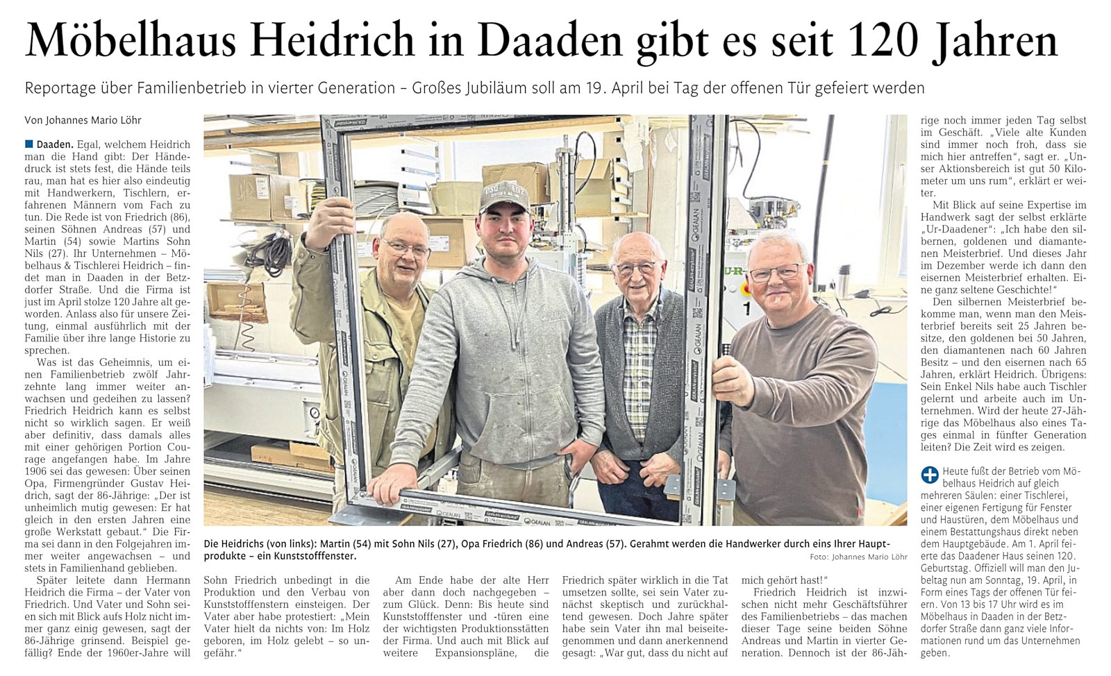 Das von den beiden Geschäftsführern Andreas und Martin Heidrich bereits in 4. Generation geführte Familienunternehmen besteht, mit nach wie vor tatkräftiger Unterstützung von Seniorchef Friedrich Heidrich, seit nunmehr fast 113 Jahren an der Betzdorferstr. 45 in Daaden. Durch jahrzentelange Berufserfahrung wird sein Rat immer wieder gerne gehört. „Im Frühjahr 2019 können wir dann auch auf eine 30-jährige Mitgliedschaft beim MZE— Verband zurückblicken.“ so Andreas Heidrich. Auch das ein Zeichen von Kontinuität und Treue.